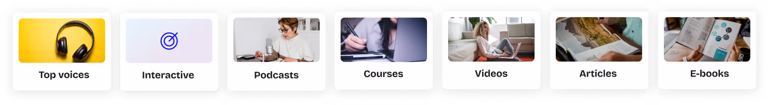 formats : vidéos, podcasts, articles & quizzes